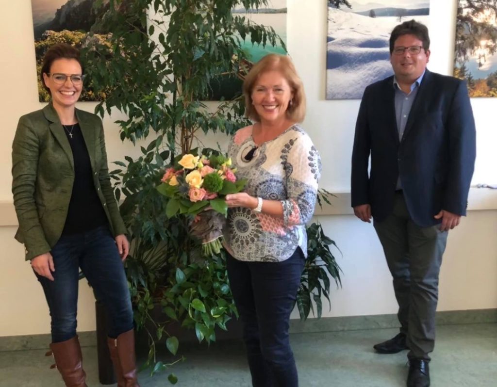 Stadträtin Spanring und Stadtrat Pober heißen Gerlinde Klammer-Minichberger willkommen Unsere Präsidentin wird von StRin Spanring und StR Pober mit einem Blumenstrauß überrascht (c) Magistrat