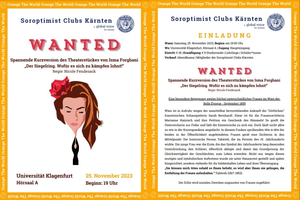 1. „Wanted“ – Theaterstück am 25.11.2023 – erstmals alle 8 SI-Clubs in Kärnten gemeinsam – der Reinerlös kommt den 4 Frauenhäusern in Kärntner zugute. Brandaktuelles Thema „Gewalt an Frauen“ im heutigen Iran.